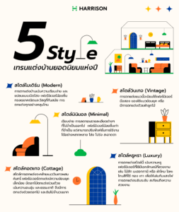 สไตล์โมเดิร์น (Modern): เน้นเส้นสายเรียบง่าย สีขาว ดำ เทา ใช้เทคโนโลยีในการควบคุมบ้าน